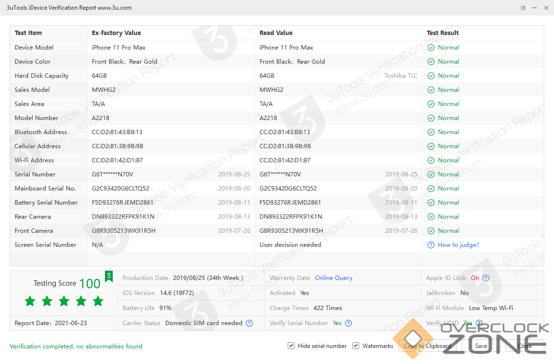 iPhone 11 Pro Max iDevice Verification Report 000879EA0E60802E