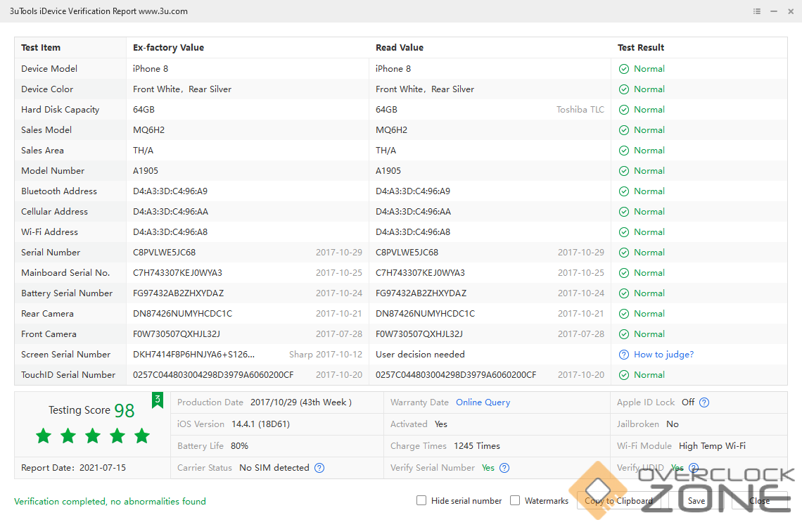 iPhone 8 iDevice Verification Report 000C459C28F3002E